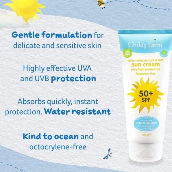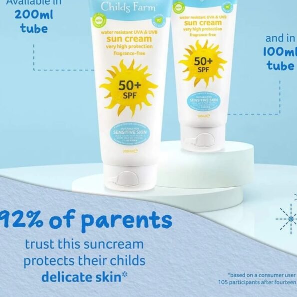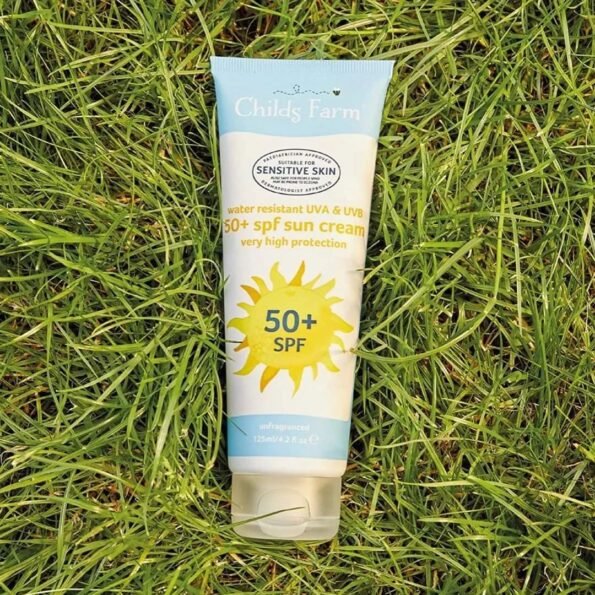 Childs Farm new formulation 50+spf sun cream for very high protection, is water resistant and protects young and sensitive skin from UVA and UVB rays, whilst keeping skin moisturised and hydrated. So you can relax while your children enjoy the sun safely.